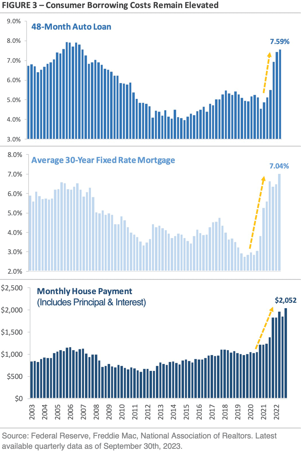 The bottom chart illustrates how the rise in mortgage rates has impacted the homebuying process. According to the National Association of Realtors, the monthly house payment has risen from $1,249 at the end of 2021 to $2,052 at the end of June. Factoring in the rise in mortgage rates during the third quarter, the current monthly house payment is likely even higher. While many homeowners locked in low mortgage rates during the past few years, today’s homebuyers are navigating a combination of higher mortgage rates and home prices that are still elevated.