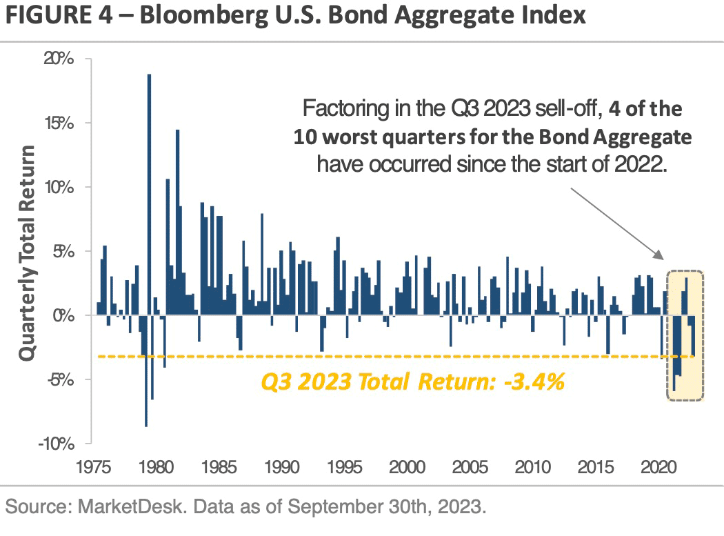 Rising interest rates were a significant headwind for bonds during the third quarter. Figure 4, which graphs the quarterly total return of the Bloomberg Bond Aggregate Index, puts the losses in perspective. The chart shows the Bond Aggregate Index, which tracks a wide array of Treasury, corporate, and municipal bonds, generated a total return of -3.2% during the third quarter. The negative total return indicates the decline in bond prices more than offset the interest received during the quarter.