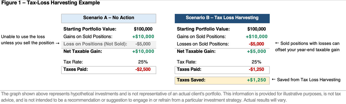 In a perfect world, investors would only see gains when checking their accounts. But in the real world, the stock market can be volatile and doesn’t always trade on a straight upward trajectory. No one wants their investments to decline, but when the market does trade lower, it’s possible to convert those losses into valuable tax assets. This process is called tax-loss harvesting and involves selling underperforming investments to create capital losses, which can offset current-year taxes or be carried forward. This process typically occurs at year-end when investors review their annual portfolio performance and the potential tax implications.