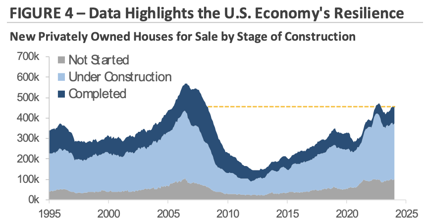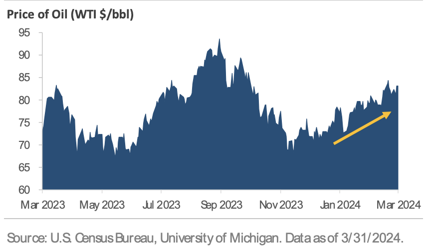 Why do investors expect fewer interest rate cuts this year? One reason is that inflation progress is slowing. Another reason is that the U.S. economy remains resilient despite higher rates. Figure 4 graphs three data points that underscore this resilience. The top chart graphs the number of new homes for sale by stage of construction: not started; under construction; and completed. The chart shows home construction activity is at levels not seen since before the 2008 financial crisis, despite the average 30-year fixed-rate mortgage sitting near a 15-year high of 7%. The middle section shows consumer sentiment rose to a 2.5-year high in March after setting a record low in June 2022. Multiple factors are contributing to the improved sentiment, including a tight labor market, rising stock prices and home values, expectations for a continued decline in inflation, and a solid economic backdrop. The bottom chart tracks the price of a barrel of West Text Intermediate crude. Crude oil prices have risen from approximately $70 per barrel at the start of the year to $83 per barrel at the end of Q1, an increase of roughly +18.5%. Oil is a cyclical commodity, so rising oil prices suggest demand is strong and may hint at underlying strength in the U.S. economy.