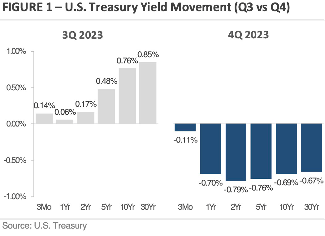 Following a significant increase in Q3, Treasury yields moved sharply lower in Q4. Figure 1, which compares the change in yields during the two quarters, graphs the opposing interest rate moves. The gray bars show yields increased in Q3, with longer maturity yields rising the most. In contrast, the navy bars show yields reversed sharply in Q4, erasing nearly all their Q3 rise. The abrupt reversal can be attributed to a significant change in the market’s view heading into 2024.