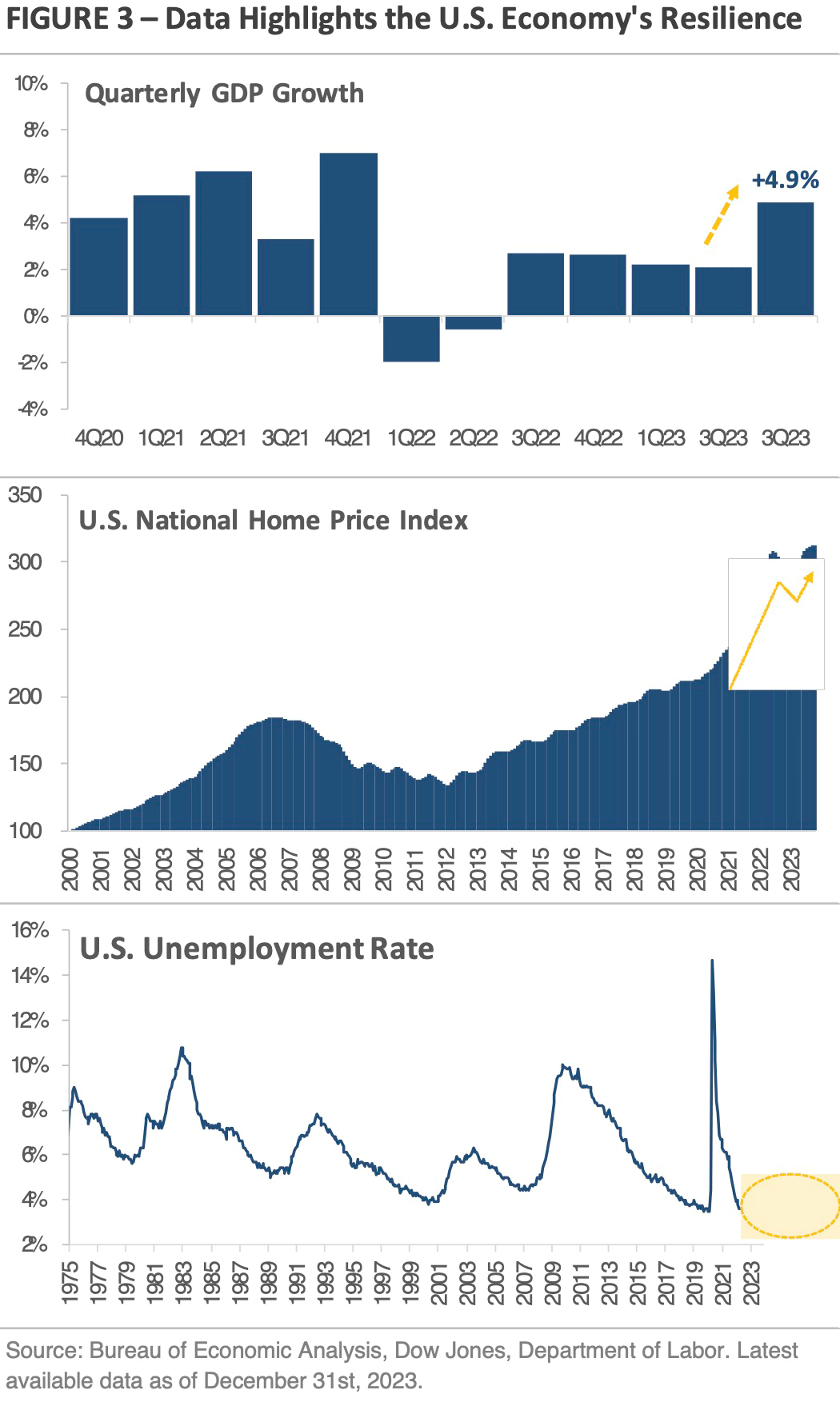 Figure 3 graphs three data points that underscore this resilience. The top chart shows the U.S. economy grew at a +4.9% annualized pace in Q3, the fastest pace since Q4 2021. Multiple factors contributed to the above-average growth, including consumer spending, government investment at the federal and state levels, and companies restocking inventories. The middle section shows the surge in U.S. home prices during the pandemic, as factors like remote work, low mortgage rates, and rising wages boosted home demand. The home price index initially peaked in mid-2022 and declined over the next 10 months as rising mortgage rates weighed on demand. However, home prices rose to a new record high as the housing market reaccelerated in the second half of 2023. The bottom chart shows the U.S. unemployment rate remains below 4%, a level that is low by historical standards and showcases the labor market’s strength.