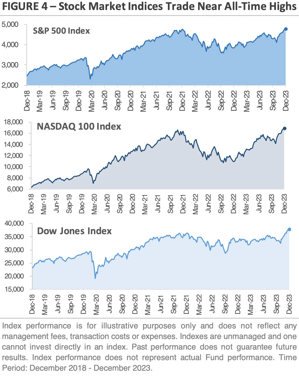 What does the financial landscape look like today? Following the Q4 rally, multiple major stock market indices are trading near all-time highs. Figure 4 on the next page graphs the prices of three broad stock market indices: the S&P 500, the NASDAQ 100, and the Dow Jones. The S&P 500 is hovering near its January 2022 all-time high, while the NASDAQ 100 and Dow Jones both made new all-time highs in December. On a year-to-date basis, the S&P 500 returned +26% in 2023, and the Russell 2000 returned +16.7%. The NASDAQ 100 soared +54.7%, its biggest year since 1999. Along the way, stocks defied higher interest rates, geopolitical tensions, and multiple U.S. regional bank failures to record solid gains.