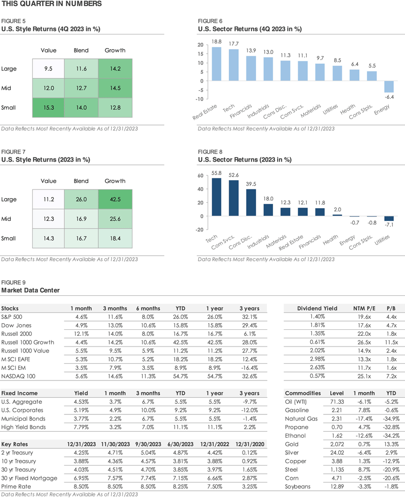 Falling interest rates were a tailwind for stocks in the fourth quarter. Key stock market indices like the S&P 500, the Dow Jones, the NASDAQ 100, and the Russell 2000 each returned more than +11%. Real estate was the top-performing sector as falling interest rates relieved pressure on property owners, and cyclical sectors outperformed defensive sectors. In December, the Russell 2000 Index of small cap stocks outperformed the S&P 500 by +7.6%, its biggest month of outperformance since February 2000. The broad-based stock market rally demonstrates investors’ growing enthusiasm, with inflation falling, the economy surpassing expectations, and the Fed signaling the end of rate hikes.