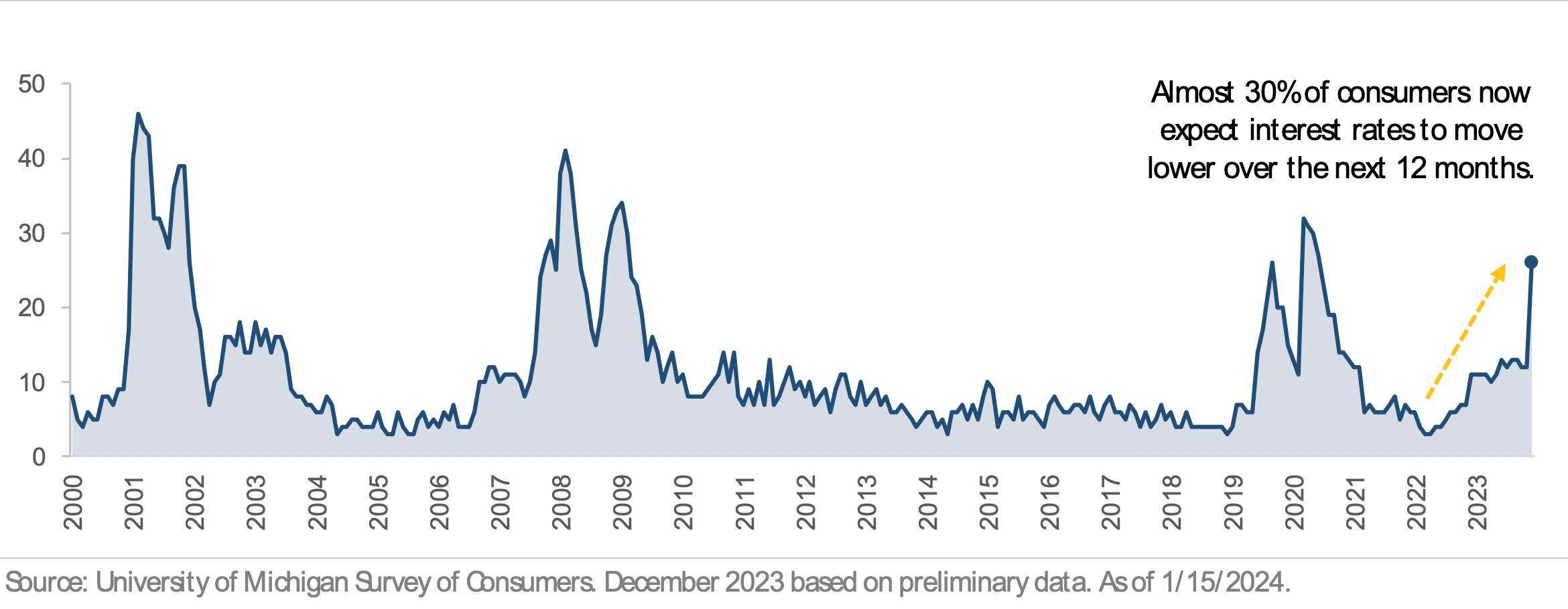 The University of Michigan publishes a monthly Survey of Consumers that assesses the confidence and expectations of U.S. consumers. It asks questions about current economic conditions, expectations for the future, and consumers’ attitudes toward making big purchases. There was a notable development in the December 2023 survey, as the percentage of consumers expecting lower interest rates over the next 12 months rose to nearly 30% from 12% the prior month. This expectation for lower interest rates is connected to easing inflation and the view that there is no need to keep interest rates at current levels with inflation falling back to 2%. Consumers and investors both expect rate cuts in the first half of 2024, and the Federal Reserve is hinting at the potential for rate cuts if inflation continues to ease this year.