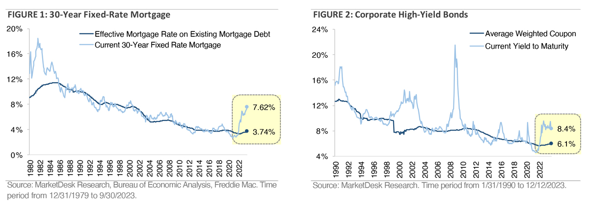 Why are the Fed’s rate hikes having only a marginal economic impact? As the two charts below show, there is a large gap between headline interest rates and the effective rate on existing debt. Figure 1 shows the average 30-year fixed-rate mortgage was 7.62% at the end of September. However, the effective interest rate on all existing mortgage debt was only 3.74%, or nearly 4% below the headline mortgage rate. Figure 2 reveals a similar dynamic in the corporate bond segment. The yield-to-maturity on a broad high-yield corporate bond index currently sits at 8.4%, a proxy for what new high-yield borrowers would pay. However, the average coupon on the bonds within the index, which more accurately reflects borrowers’ actual interest rate, is only 6.1%, or 2.5% below the current high-yield borrowing rate.