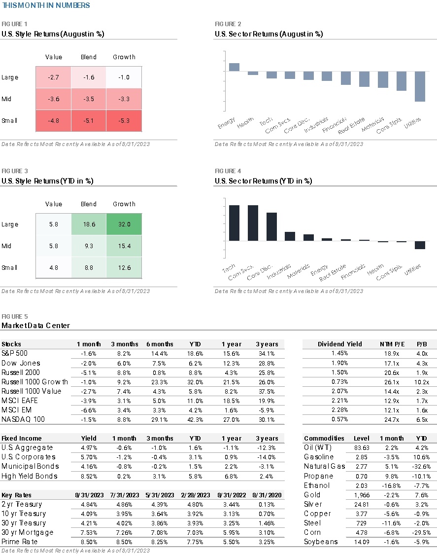 The S&P 500 traded lower during the first half of August, at one point erasing all of July’s 3.3% gain. The sell-off occurred as investors worried about the potential for further interest rate hikes and increased bond issuance by the Treasury to fund government spending. Interest rates rose to levels last seen in 2007, with the 10-year Treasury yield climbing to 4.35%. This sudden rise in interest rates caught the market by surprise and weighed on stock market valuations. However, interest rates reversed a portion of their rise later in the month, with the 10-year Treasury retreating to 4.09%. The S&P 500 found its footing as yields declined and recovered to finish the month with a -1.6% decline, its first monthly loss since February of this year.