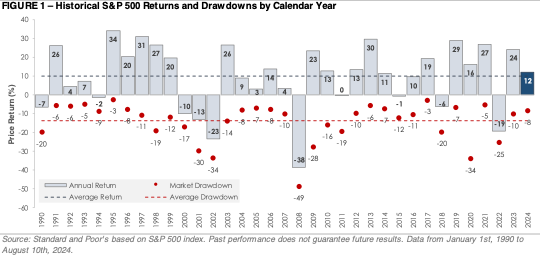 The stock market had a strong start this year. The S&P 500 gained over +15% in the first six months, its 16th strongest first-half return since 1931. The equity market’s rise continued into early July, and the index set a new all-time closing high on July 16th. However, the stock market experienced increased volatility as it traded lower over the past few weeks. The selloff accelerated in the first week of August after a report showed unemployment rose to 4.3% in July, a nearly 3-year high. The recent volatility has been a notable change from the first half’s steady climb, with the S&P 500 at one point -8% below its all-time high from mid-July.