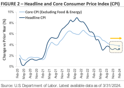 In the corporate bond category, investment-grade bonds underperformed high-yield bonds during Q1. Over the past twelve months, high-yield corporate bonds have generated a total return of +8.8%, which factors in the interest payments received. Investment-grade corporate bonds generated a +3.5% total return over the same period. The high-yield bond universe continues to benefit from multiple themes. First, the group yields 7.83% at the end of Q1, which is 2.45% higher than investment-grade bonds. This extra yield helps boost high-yield’s total return. Second, as Figure 4 highlights, the U.S. economy has remained resilient despite higher interest rates. With the U.S. economy expanding at a solid pace, high-yield bonds’ credit risk has remained stable, limiting the number of defaults.